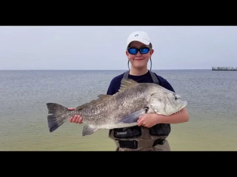 Black Drum (Pogonias cromis) reach a maximum size of just over 100 pounds but the “bulls” usually range in the 25 to 40 pound range. They have deep bodies with 4 or 5 broad black bars on there sides. They look very similiar to sheephead but get much larger. They also have barbel around the mouth unlike sheephead. Black drum occur throughout the Gulf of Mexico, up the Atlantic to Maine and even down to Brazil.
